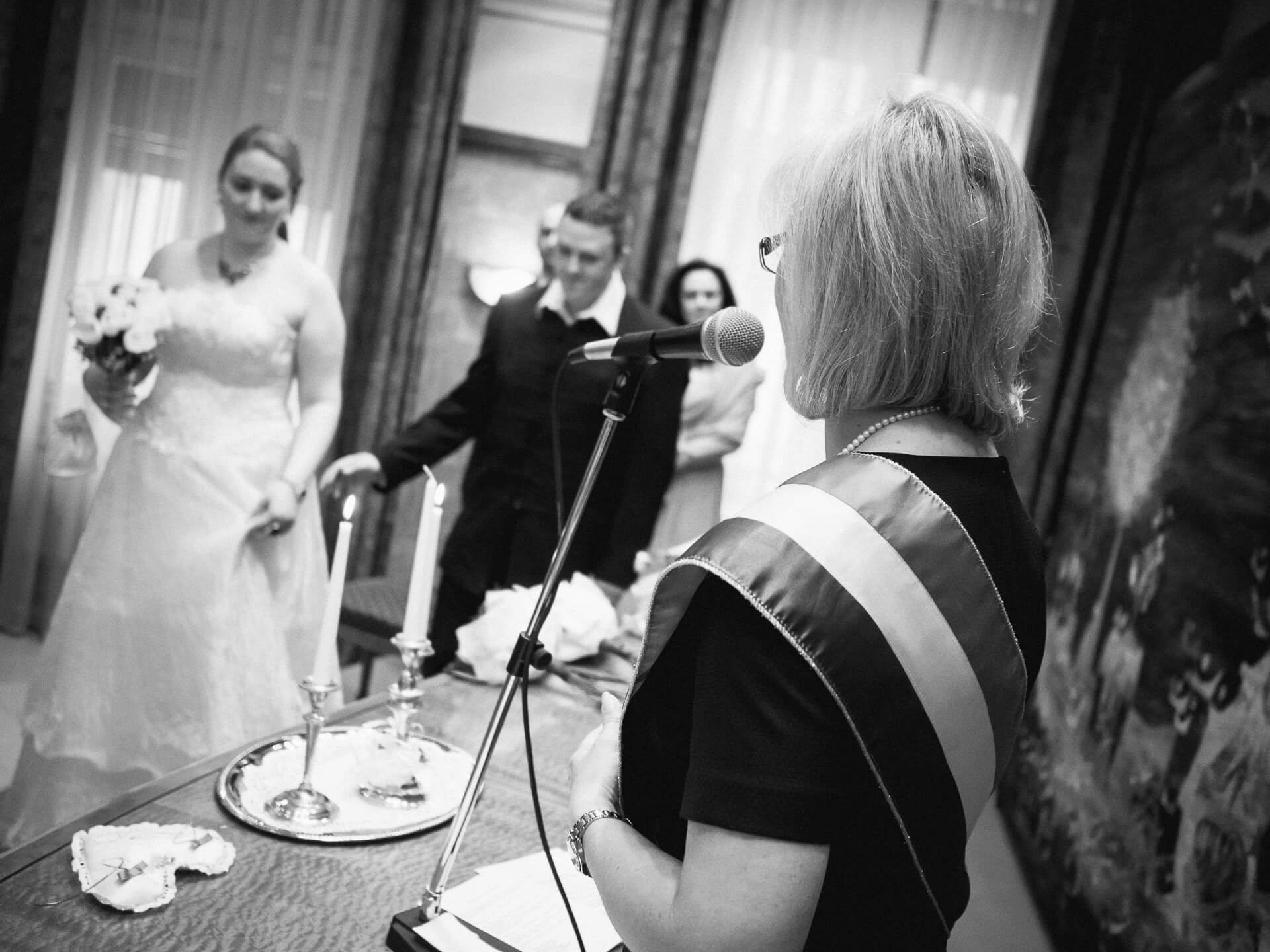 Vannak már valóban halk gépek, sőt teljesen hangtalanok is. A tükör nélküli fényképezőgépek belsejében nem csattog a tükör, csupán a zárat lehet hallani. Sőt, az elektromos zár óta már azt sem feltétlenül. Ráadásul ezeknek a gépeknek nincsen képminőségbeli hátránya a tükrös társaikhoz képest, ezért joggal mondhatjuk, hogy vannak események, amelyeket illetlenség hangos géppel fotózni. Ilyen esemény az esküvő is. A mi táskánkban jelenleg Olympus OM-D gépek és egy Fujifilm X100 található, mindegyikük halk és kicsi. Az objektívek kicsi és fényerős fixek, amelyekkel garantált a lehető legjobb képminőség. A felszerelésünk nem zavaró, nem feltűnő. Először kicsit tartottam attól, hogy a násznép nem adja meg a kellő tiszteletet – így esetleg ellehetetleníti a munkánkat –, de a félelmem alaptalan volt: a fényképezőgép méreténél sokkal fontosabb a fotós mozgása, viselkedése és kommunikációja.